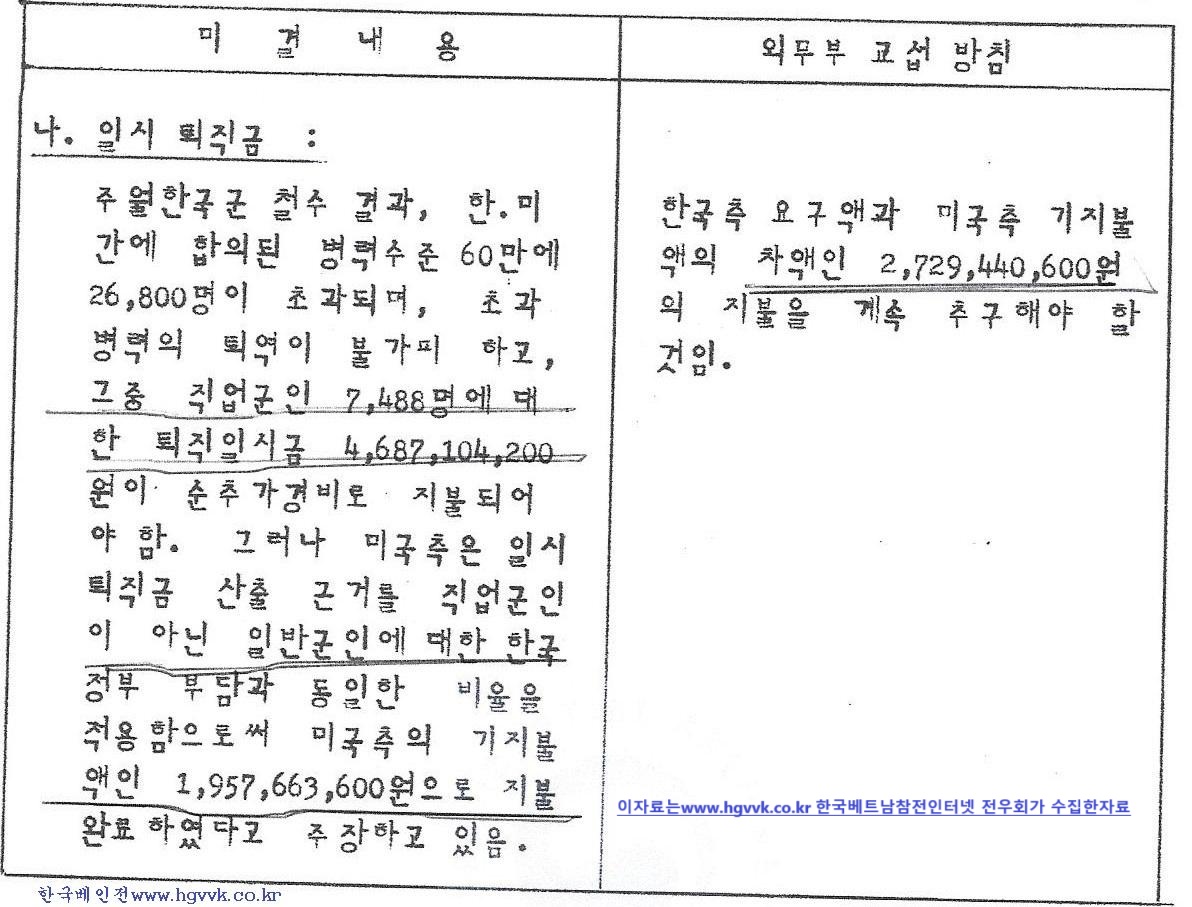 °á·ÐÀûÀ¸·Î, º£Æ®³² ÂüÀü ÀÏ¹Ý ±ºÀεéÀÌ ÁÖÀåÇÏ´Â ¹ÌÁö±ÞµÈ 'ÅðÁ÷±Ý' ¶Ç´Â 'ÀüÅõ±Ù¹«¼ö´ç'ÀÇ »ó´ç ºÎºÐÀº ´ç½Ã Çѱ¹ Á¤ºÎ¿¡ ÀÇÇØ Àü¿ëµÇ¾î ±¹°¡ °æÁ¦ °³¹ß¿¡ »ç¿ëµÇ¾ú´Ù´Â °ÍÀÌ ÀϹÝÀûÀÎ ÀÇȤÀÇ ÇÙ½ÉÀÔ´Ï´Ù. ÇöÀç ÂüÀü ¿ë»çµéÀº ÀÌ¿¡ ´ëÇÑ ¸íÈ®ÇÑ Áø»ó ±Ô¸í°ú Á¤´çÇÑ º¸»óÀ» ¿ä±¸Çϰí ÀÖ½À´Ï´Ù.